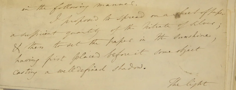 I proposed to spread on a sheet of paper a sufficient quantity of the nitrate of silver; & then to set the paper in the sunshine, having first placed before it some object casting a well defined shadow.